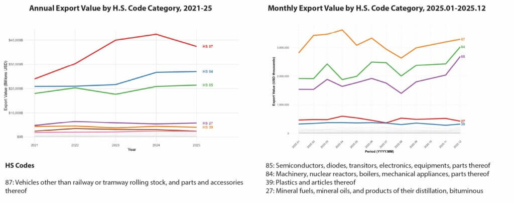 Similar results can be found when comparing the annual range or difference between the monthly maximum and minimum in each year for South Korea’s exports to the U.S., China, and the world. What we see is a marked increase in 2025 compared to 2024. However, that increase in range was more pronounced for China than for the United States. For instance, the range for China in 2025 was $6.72 billion (Maximum: $17.61 billion in December; Minimum: $10.89 billion in January), which was an over 2.7-fold increase from $2.433 billion in 2024 (Maximum: $15.06 billion in December; $12.627 billion in February). For the U.S., the range was $2.08 billion in 2024 and $3.62 billion in 2025, which is only an approximately 1.7-fold increase.