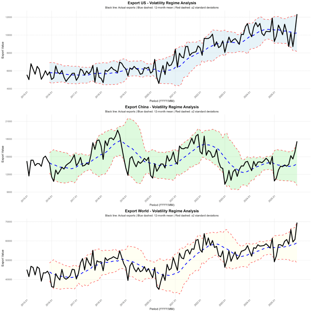Figure 4. Volatility in Monthly Export to the U.S., China, and World, 2015.01 – 2025.12 (in $ Millions)