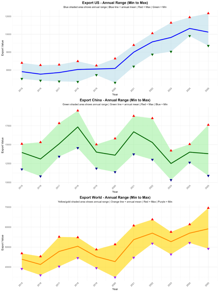 Figure 5. Annual Range for Exports to the U.S., China, and World, 2015.01 – 2025.12 (Unit: in $ Million)