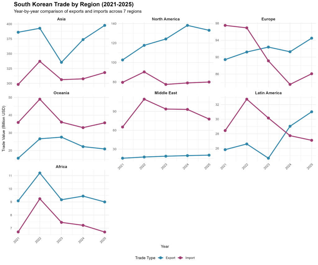 Figure 6. Annual South Korean Trade by Region, 2021-25 (in $ Billion)