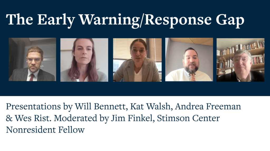 Will Bennett, Fellow at The Centre on Armed Groups, will walk us through a co-authored recent essay published through NYU’s Center on International Cooperation on the Early Warning/Response Gap. Three former US officials, Kat Walsh, Andrea Freeman, and Wes Rist, who have wrestled with this issue across several administrations, will offer some thoughts. Presenters Moderator