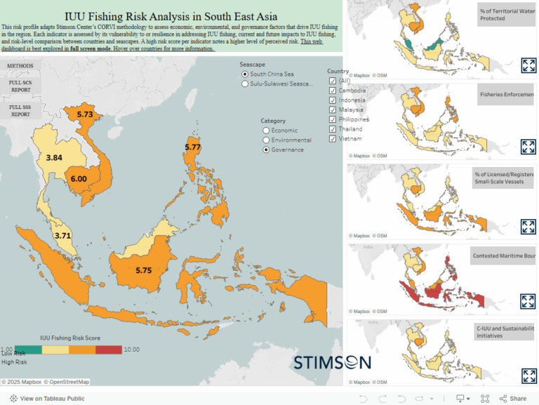 To equip policymakers with actionable insights, the Stimson Center developed a data-driven IUU Fishing Risk Assessment framework, adapted from the Environmental Security Program’s Climate and Ocean Risk Vulnerability Initiative (CORVI). This methodology evaluates key economic, environmental, and governance risk factors, enabling targeted interventions in high-risk areas. The findings and resources of this project not only illuminate the scale and impact of IUU fishing but also provide practical policy recommendations to enhance maritime security and promote sustainable fisheries management across the region.