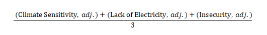 - To facilitate comparisons, the climate sensitivity, access to electricity, and insecurity data are adjusted by converting them to scored values from 0 to 100.
