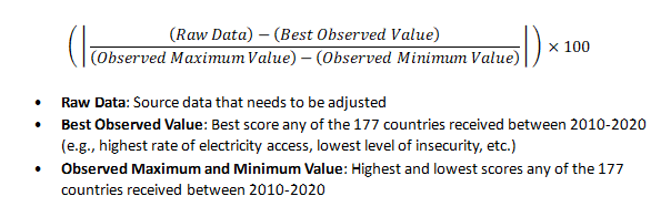 - Rather than each extreme (i.e., 0 and 100) reflecting the theoretical best and worse outcomes, they are instead linked to the actual best and worst outcomes observed in our sample of 177 counties between 2010-2020. For example, in the Fragile States Index’s Security Apparatus data (which is the basis for our insecurity data), there was not a single country that received a perfect score of 0 out of 10 between 2010-2020, which would indicate absolute security. The lowest actual score was 0.7. Countries that received this insecurity score in given year would, for that year, have an adjusted insecurity score of 0 out of 100. This would indicate not that they had perfect security, but that they were among the most secure countries between 2010-2020. At the other end, there were instances of complete insecurity with actual states at 10 so their score was adjusted directly to 100.